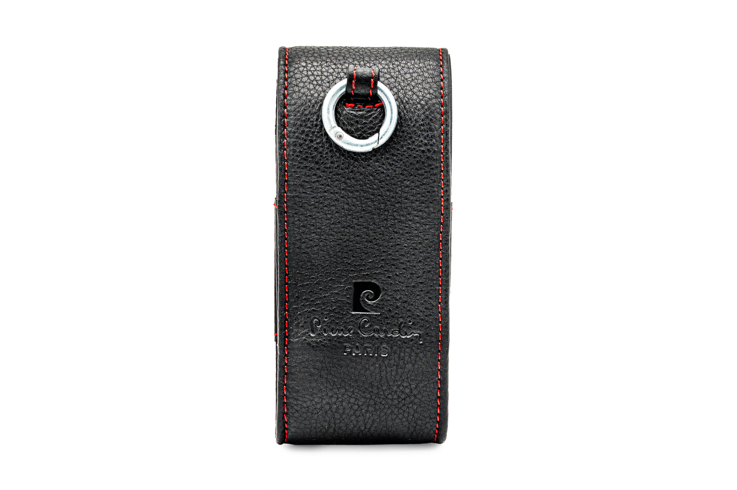 - Elegant black finish with detailed red stitching.