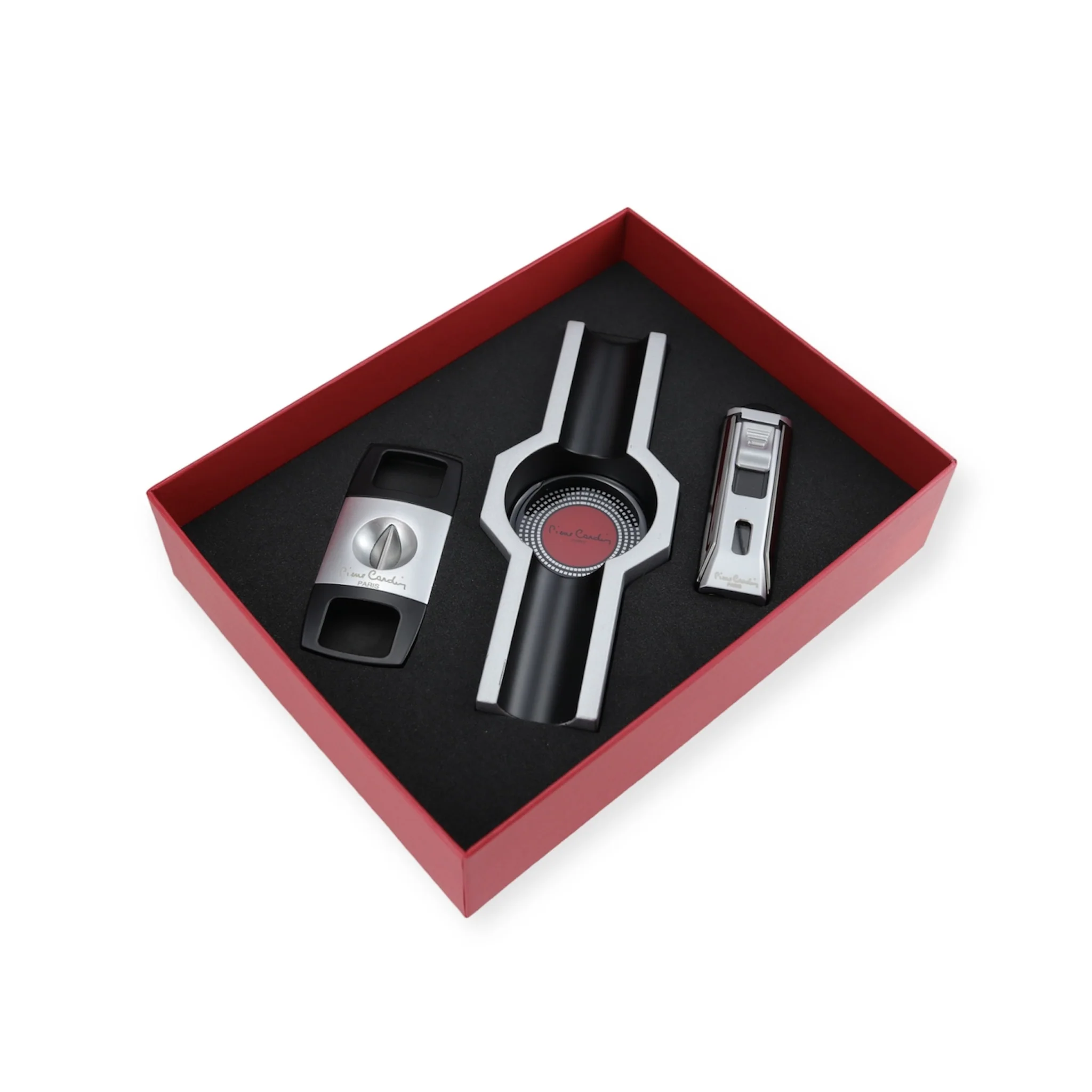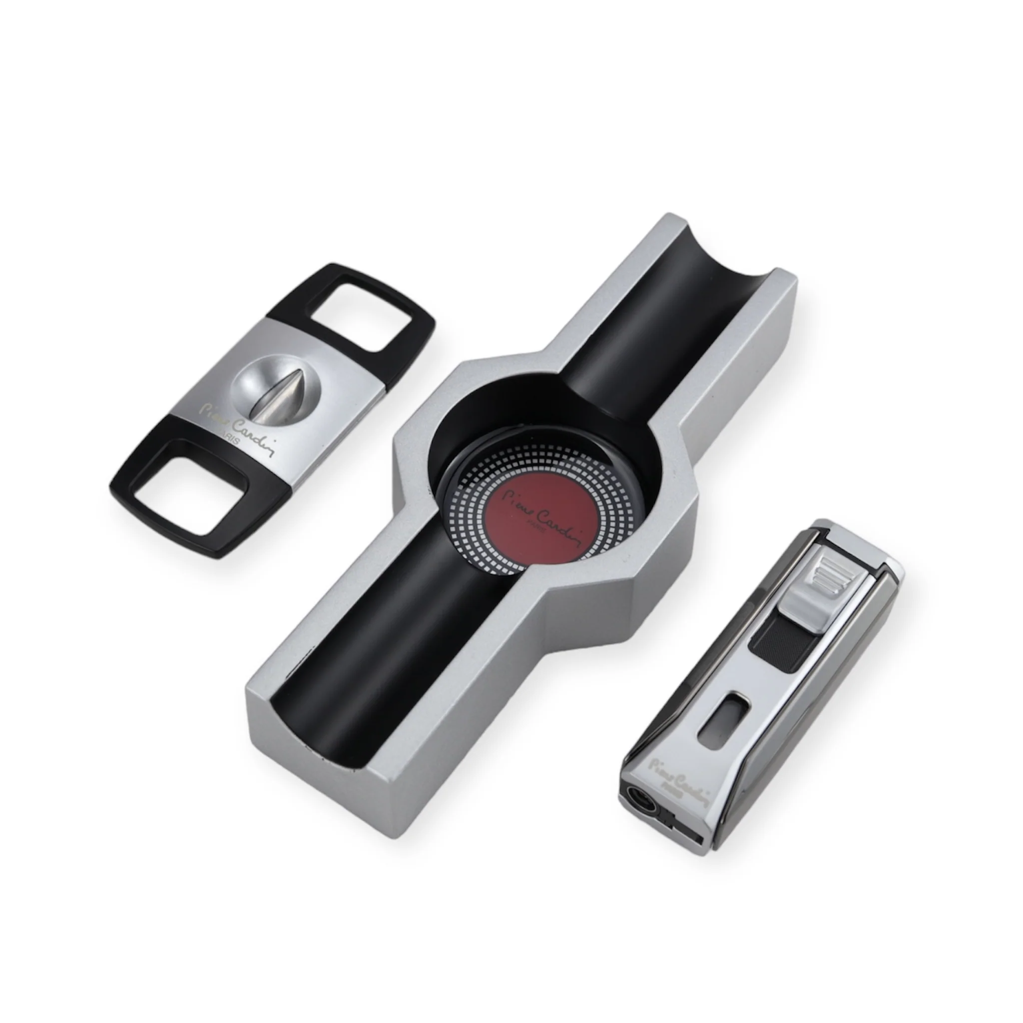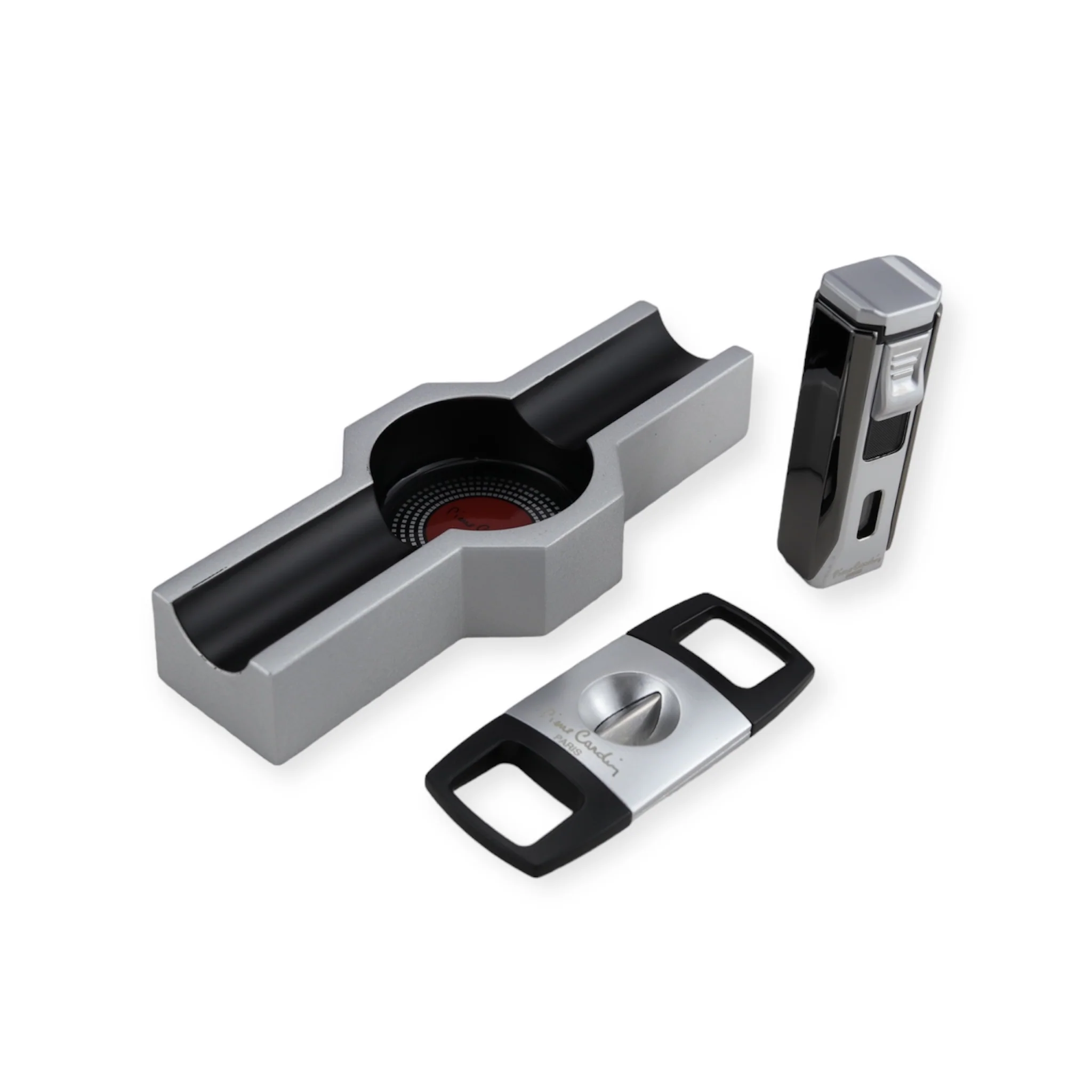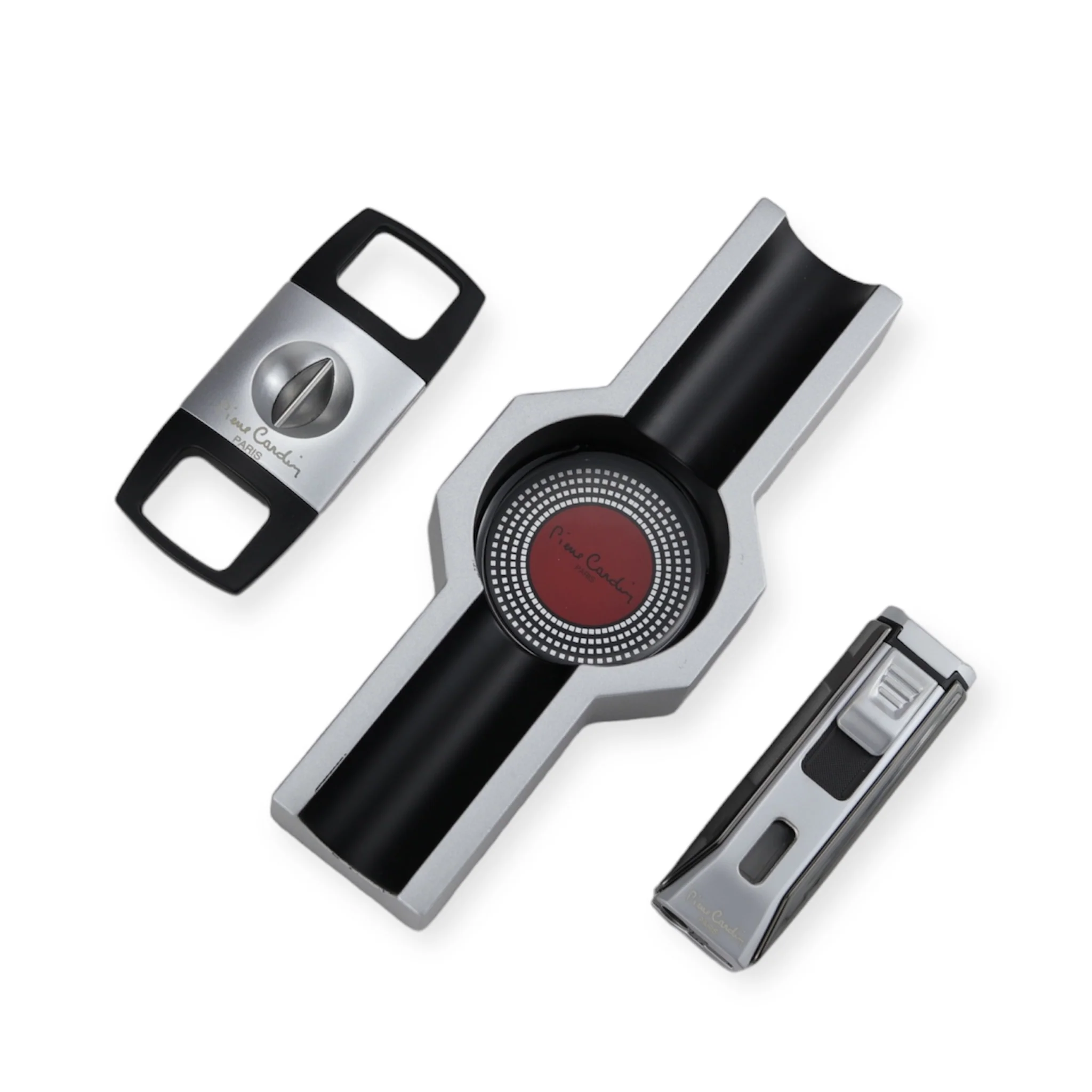 Pierre Cardin Cigar Set PCX-025 – Luxury Double Holder Ashtray, Lighter and V-Cut Set in Black & Silver
